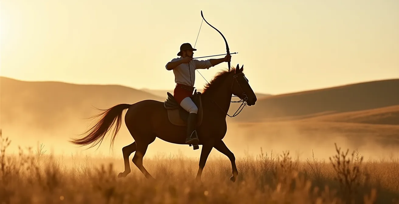 Pour comprendre l’âme de l’archerie équestre, il faut remonter le temps et sentir le souffle des steppes d’Asie centrale. Contrairement à des disciplines nées pour le loisir ou le travail du bétail, l’archerie montée a une seule et unique origine : la guerre et la chasse. C’est l’arme absolue des peuples nomades, des Scythes aux Huns, des Parthes aux Magyars, et bien sûr, des Mongols. Ces cavaliers n’étaient pas simplement des soldats à cheval ; ils formaient une cavalerie légère et rapide qui a redéfini l’art de la guerre. Leur tactique, basée sur le harcèlement, la feinte et la vitesse, était rendue possible par cette capacité à tirer en plein galop.